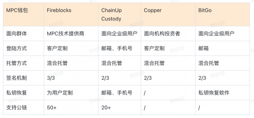 雖然都是MPC錢包,但它們在產(chǎn)品定 位市場、登陸方式、托管機(jī)制、私鑰恢復(fù)等維度有部分差異,下圖匯總了這些產(chǎn)品的異同之處: