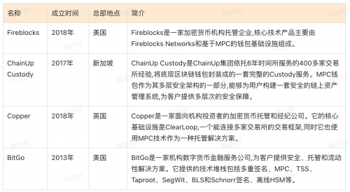 我們選取了業(yè)內(nèi)知名度較高、資歷較老的四家公司,包括Fireblocks、ChainUp Custody、Copper、BitGo。這些公司都提供數(shù)字貨幣托管服務(wù),于近幾年先后推出了MPC錢包解決方案,以下是關(guān)于它們的簡要介紹: