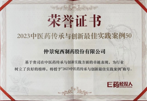 仲景宛西制藥股份有限公司被授予“2023中醫(yī)藥傳承與創(chuàng)新最 佳實(shí)踐案例”稱號(hào)。
