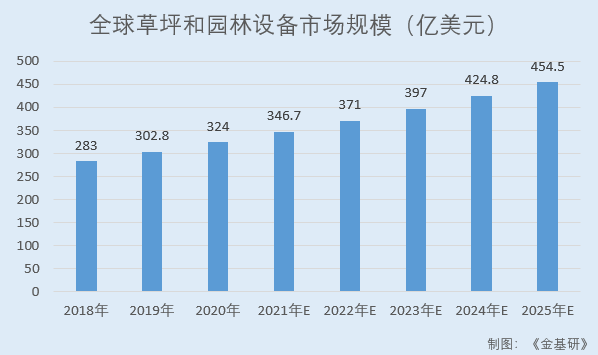 根據(jù)全球市場(chǎng)研究公司(Global Market Insights, Inc.)統(tǒng)計(jì)數(shù)據(jù),2018-2020年,全球草坪和園林設(shè)備市場(chǎng)規(guī)模分別為283億美元、302.8億美元、324億美元,預(yù)計(jì)至2025年將超過450億美元。