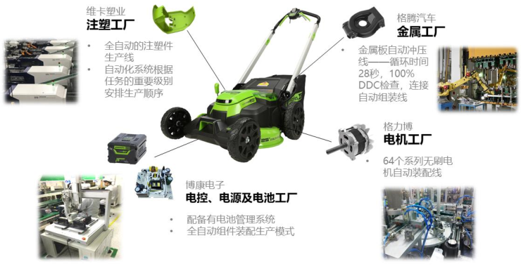 作為全球新能源園林機(jī)械行業(yè)的領(lǐng) 先企業(yè)之一,格力博通過構(gòu)建垂直一體化的智能制造體系,實(shí)現(xiàn)降本增效,提升產(chǎn)品競(jìng)爭(zhēng)力。同時(shí),格力博還創(chuàng)新性地開發(fā)了多個(gè)電池包動(dòng)力平臺(tái),實(shí)現(xiàn)電池包在不同產(chǎn)品之間的互通互用,形成以鋰電池包為核心的產(chǎn)品生態(tài)系統(tǒng)。