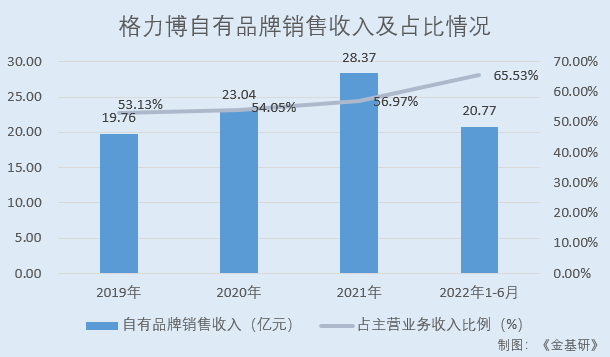 2019-2021年及2022年1-6月,格力博自有品牌銷售收入分別為19.76億元、23.04億元、28.37億元、20.77億元,占主營(yíng)業(yè)務(wù)收入比例分別為53.13%、54.05%、56.97%、65.53%。