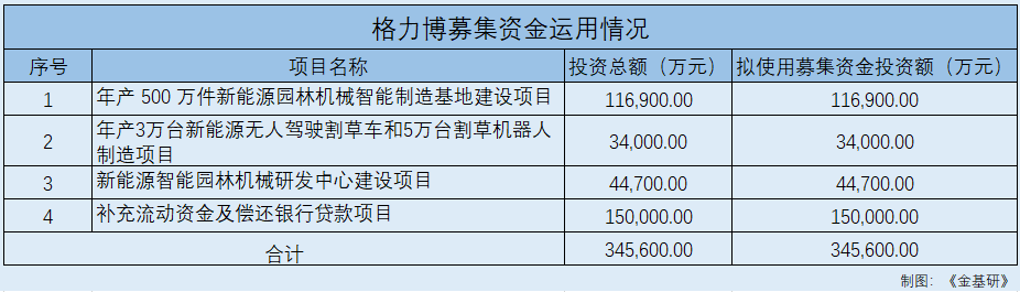 此番上市,格力博擬募集資金34.56億元投入四個(gè)募投項(xiàng)目,分別為“年產(chǎn)500萬件新能源園林機(jī)械智能制造基地建設(shè)項(xiàng)目”、“年產(chǎn)3萬臺(tái)新能源無人駕駛割草車和5萬臺(tái)割草機(jī)器人制造項(xiàng)目”、“新能源智能園林機(jī)械研發(fā)中心建設(shè)項(xiàng)目”、“補(bǔ)充流動(dòng)資金及償還銀行貸款項(xiàng)目”。