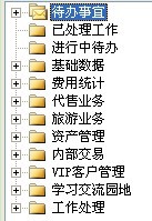 該平臺(tái)包括:(待辦事宜、已處理工作、進(jìn)行中待辦)、基礎(chǔ)數(shù)據(jù)、費(fèi)用統(tǒng)計(jì)、代售業(yè)務(wù)、旅游業(yè)務(wù)、資產(chǎn)管理、內(nèi)部交易、VIP客戶管理、學(xué)習(xí)交流園地和工作處理十大模塊。