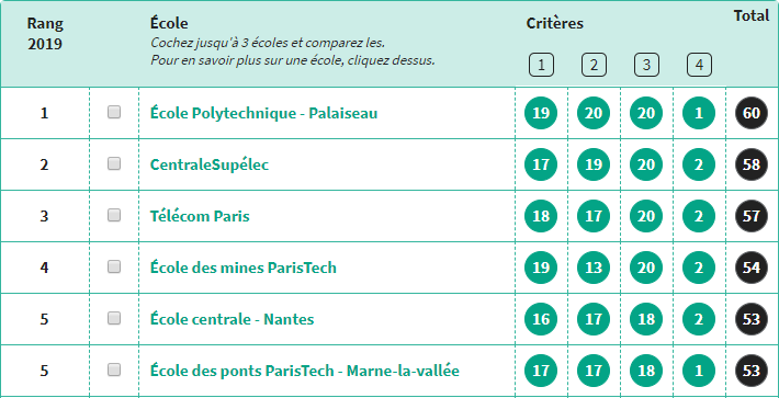在L'étudiant學(xué)生報(bào)年度法國(guó)工程學(xué)院綜合排名中,共統(tǒng)計(jì)了近200個(gè)法國(guó)的工程師學(xué)院,其中巴黎高科路橋大學(xué)位列全法第4位。
