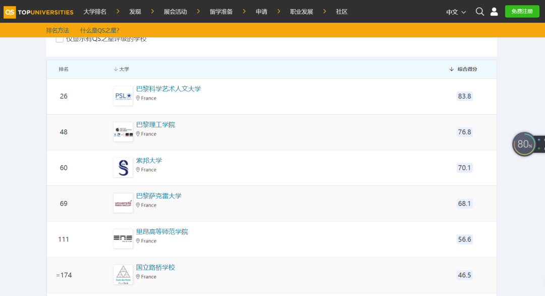 2023年QS世界大學(xué)排名榜中,巴黎高科路橋大學(xué)位列全球第174位,相比2022年提升了73位。在法國(guó)院校排名中居第6名。該排名榜涵蓋了世界85個(gè)國(guó)家的1400所院校。