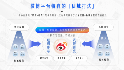 微博作為領(lǐng) 先的開(kāi)放式社交媒體平臺(tái),海量公域流量與用戶(hù)關(guān)系交織融合,私域和公域緊密相連,這一優(yōu)勢(shì)決定了微博特有的“私域打法”。公私域聯(lián)動(dòng)能夠幫助品牌利用公域流量場(chǎng)快速提高聲量,沉淀私域社交資產(chǎn),從而影響用戶(hù)心智,實(shí)現(xiàn)更持續(xù)的價(jià)值釋放。