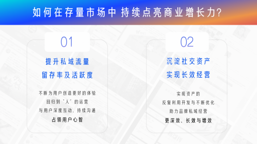 簡(jiǎn)言之,由公私域引流所積累的社交資產(chǎn)就是品牌營(yíng)銷(xiāo)的核心競(jìng)爭(zhēng)力。那么如何在存量市場(chǎng)中高效沉淀社交資產(chǎn),持續(xù)點(diǎn)亮商業(yè)增長(zhǎng)力?有兩個(gè)問(wèn)題亟需解決:一是提升私域流量留存率與活躍度,不斷為用戶(hù)創(chuàng)造更好的體驗(yàn),從而占領(lǐng)用戶(hù)心智;二是要完成社交資產(chǎn)的反復(fù)利用開(kāi)發(fā)與不斷優(yōu)化,以此激發(fā)品牌私域經(jīng)營(yíng)能力,實(shí)現(xiàn)長(zhǎng)效經(jīng)營(yíng)。