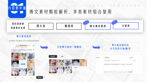 具體到產(chǎn)品上,微博超粉將支持已有博文素材“一鍵解析”,解析后可以進(jìn)行增、刪、改,多類(lèi)素材組合復(fù)用,提高創(chuàng)意組合的靈活性。