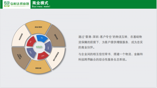 弘恒達(dá)供應(yīng)鏈(深圳)有限公司,專注電子元器件物流供應(yīng)鏈領(lǐng)域,全國管理運(yùn)營倉儲面積超200萬平方,是一家全球性、智慧型供應(yīng)鏈協(xié)同企業(yè),有供應(yīng)鏈管理的金融服務(wù)、咨詢服務(wù)、運(yùn)營服務(wù)、香港倉庫的理貨、改標(biāo)簽、改包裝、倉儲等業(yè)務(wù),服務(wù)世界500強(qiáng)、中國500強(qiáng)客戶以及其他中小型企業(yè)超3000家,為全球多知名企業(yè)提供高效的“B2B+B2C+運(yùn)營執(zhí)行”供應(yīng)鏈協(xié)同服務(wù),助力品牌廠商應(yīng)對持續(xù)變革的消費市場。