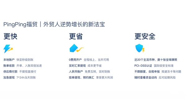 海外市場規(guī)模增長加上政策紅利導(dǎo)向,中國的外貿(mào)及電商行業(yè)迎來發(fā)展新機遇,但隨著全球金融環(huán)境變動加劇,匯率波動復(fù)雜化讓外貿(mào)企業(yè)在國際貿(mào)易中面臨許多不確定風(fēng)險。傳統(tǒng)的支付流程速度慢、效率低、到賬時間不確定,從實施到最終結(jié)算還需經(jīng)過許多中間機構(gòu)。PingPong福貿(mào)以匯率管理切入企業(yè)服務(wù),運用金融科技革新支付流程中的各個環(huán)節(jié),整合優(yōu)質(zhì)行業(yè)資源,縮短交易鏈條,助力企業(yè)的全球業(yè)務(wù)。