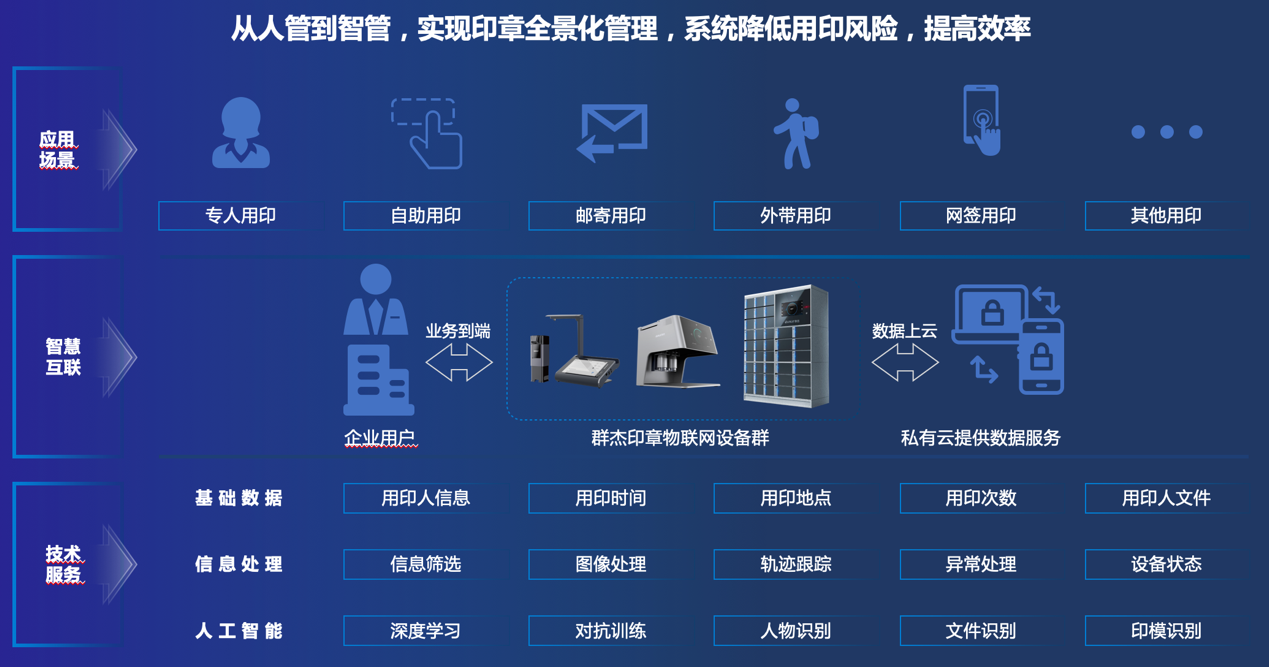 1、業(yè)務(wù)全流程合規(guī),通過智能印章規(guī)范用印授權(quán),控制用印行為、記錄用印過程、實現(xiàn)用印存檔;