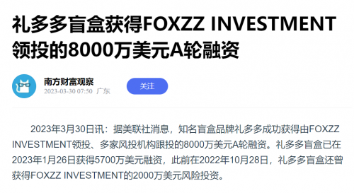 近日,據(jù)美聯(lián)社消息,中國盲盒品牌禮多多成功完成A輪融資,獲得由FOXZZ INVESTMENT領(lǐng)投、多家風(fēng)投機構(gòu)跟投的8000萬美元投資。此前,禮多多已獲得兩輪共計7700百萬美元的戰(zhàn)略融資。