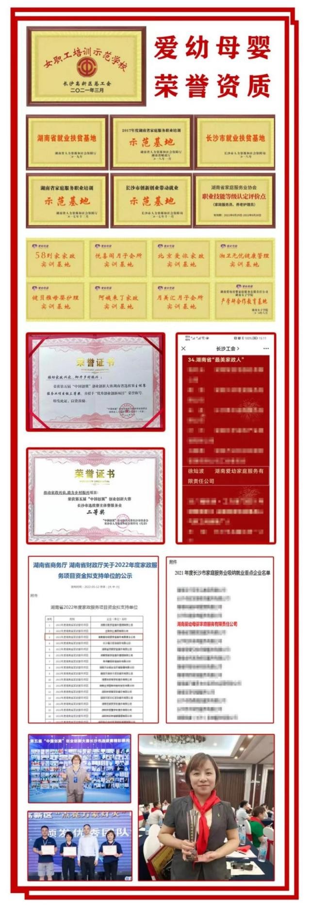 湖南愛(ài)幼母嬰家庭服務(wù)有限責(zé)任公司是一家集高端母嬰技能培訓(xùn)、高端母嬰服務(wù)、高端家政服務(wù)于一體的綜合性現(xiàn)代家庭服務(wù)企業(yè)。我們以讓更多女性擁有自己的事業(yè)為使命!培訓(xùn)項(xiàng)目包括高端月嫂、高級(jí)育嬰師、催乳師、小兒推拿、產(chǎn)后修復(fù)、一指私密、師資培訓(xùn)、創(chuàng)業(yè)培訓(xùn)等,被評(píng)為湖南省人力資源和社會(huì)保障廳、湖南省財(cái)政廳認(rèn)定的湖南省家庭服務(wù)職業(yè)培訓(xùn)示范基地,還是國(guó)家商務(wù)部家政扶貧首批試點(diǎn)企業(yè)。