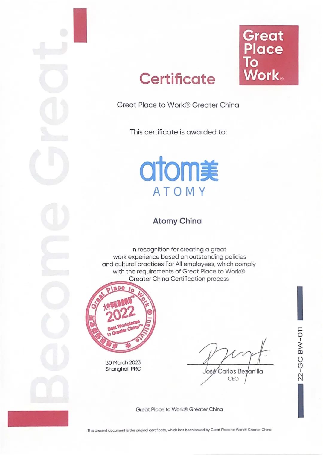 去年,艾多美(中國)憑借在人才發(fā)展、創(chuàng)新文化、員工福祉等方面的卓越成就,通過了認證機構的嚴格審核,最終于今年年初榮獲“2022年大中華區(qū)最佳職場”獎項,這充分說明了Great Place To Work專業(yè)機構對艾多美的認可,體現(xiàn)了艾多美員工對艾多美(中國)公司的工作環(huán)境和對企業(yè)文化的肯定!