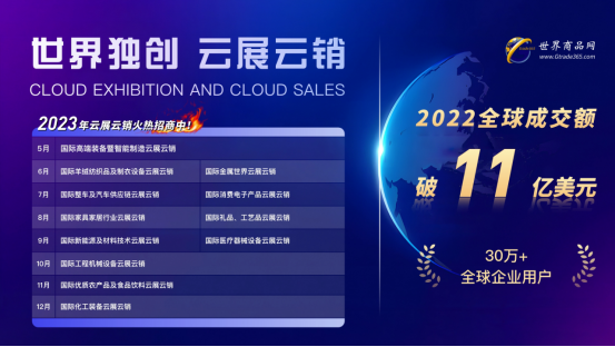 目前2023年共有12場云展云銷活動正在火熱招商中,分別是5月的高端裝備暨智能制造展、6月國際金屬世界展和羊絨紡織品及制衣設備展、7月的整車及汽車供應鏈展和消費電子產品展、8月的家具家居行業(yè)展和禮品及工藝類產品展、9月的新能源及材料技術展和醫(yī)療器械設備展、10月的工程機械設備展、11月的優(yōu)質農產品及食品飲料展、12月的化工裝備展。12場云展云銷活動涵蓋了近300余個類目,世界商品網更是邀請了東盟、中東和拉美等新興市場和歐盟和北美等傳統(tǒng)市場的國際采購團隊及優(yōu)質采購商參與線上一對一對接會,為參展企業(yè)創(chuàng)造快速獲得海外貿易訂單的機遇。