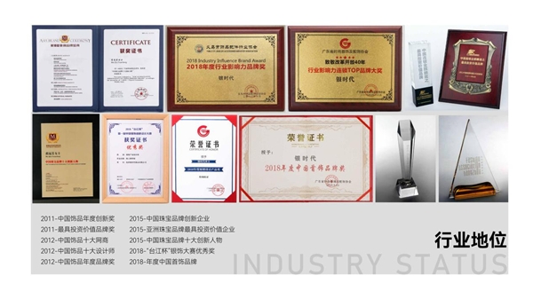 一直以來,銀時(shí)代通過時(shí)尚領(lǐng)先的技術(shù)工藝和源源不斷的創(chuàng)作靈感,在中國珠寶首飾行業(yè)里扶搖直上,相繼獲得了諸多來自業(yè)界的各項(xiàng)榮譽(yù)。銀時(shí)代在亞洲品牌盛典中摘取“亞洲珠寶品牌最具投 資價(jià)值企業(yè)”、“中國珠寶品牌創(chuàng)新企業(yè)”獎(jiǎng)項(xiàng);在中國飾品高峰論壇上連續(xù)兩屆獲得獲得“ 中國飾品年度創(chuàng)新獎(jiǎng)”、“中國飾品年度品牌獎(jiǎng)”、“中國飾品十大設(shè)計(jì)師”, 榮獲中國連鎖財(cái)富論壇金麒麟獎(jiǎng)授予的“最具投 資價(jià)值品牌獎(jiǎng)”。