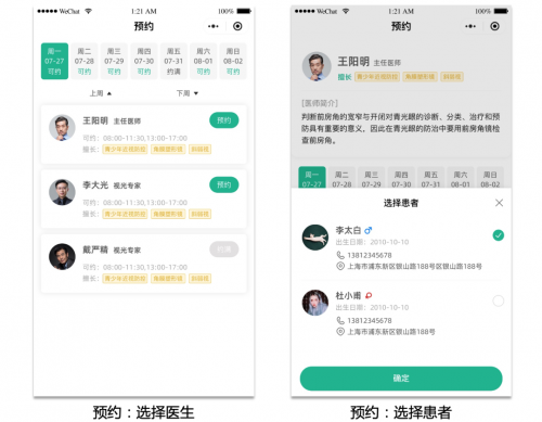 以眼科診所為例,進入到預約頁面,患者可根據(jù)醫(yī)生的簡介、排班時間預約醫(yī)生。同樣的,作為醫(yī)生,使用系統(tǒng)時,也可根據(jù)的時間選擇當天接診的病患人數(shù)。