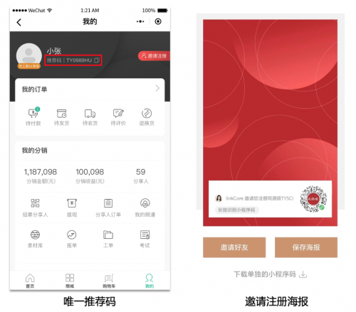 激勵老用戶拉新,系統(tǒng)中設置的專屬推薦碼,不僅適用于導購、分享官、老用戶,還可根據(jù)推薦碼做好渠道跟蹤。老用戶通過邀請注冊海報的分享,即可讓新客進入到商城中來。老客拉新,還可在系統(tǒng)中設置符合診所或門店返傭規(guī)則,以此激勵老客帶新客。