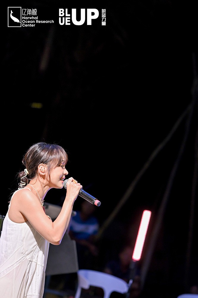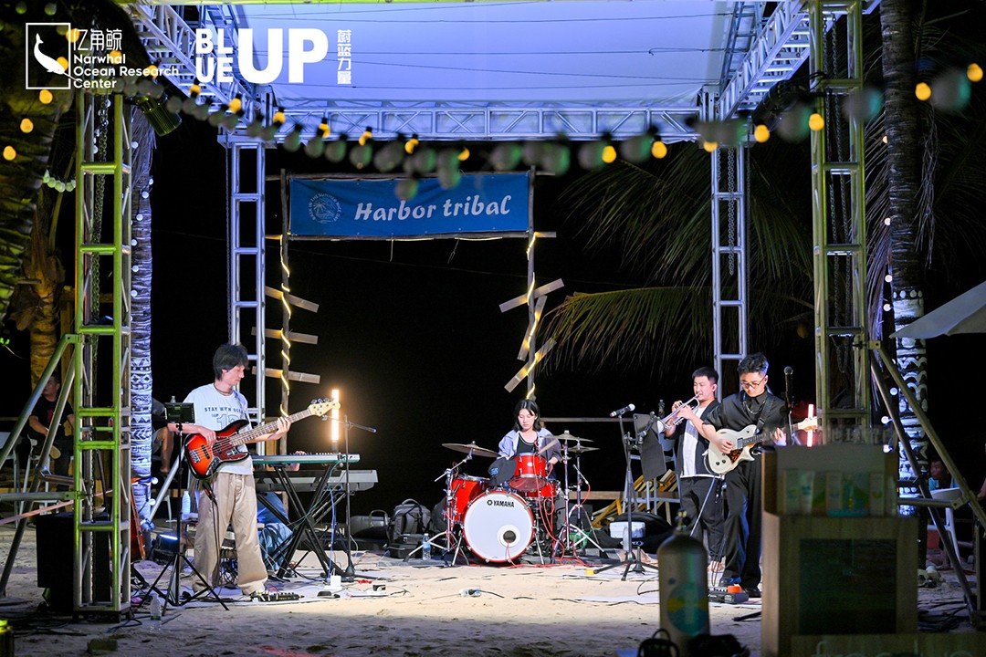 當(dāng)夜幕降臨,在萬寧新群灣的沙灘上,白天在海邊和水下忙碌行動(dòng)的伙伴們聚集在一起,伴隨著的層層海浪的聲音,磊落樂隊(duì)用一曲“鯨落”開啟了人與海洋之間的奇妙律動(dòng)?!白屛邓{(lán)之境重啟,予以海洋新生”的音樂分享會(huì),讓大家感受到神秘浩瀚的大海,孕育了世間萬物。每當(dāng)望見那片一望無際的蔚藍(lán),聽著延綿不絕的海浪聲,我們的內(nèi)心寧靜而平和。一鯨落,萬物生,最終在歌手林采欣的一曲《鯨落》的歌聲中,我們望向大海,共同以旋律喚起新生。