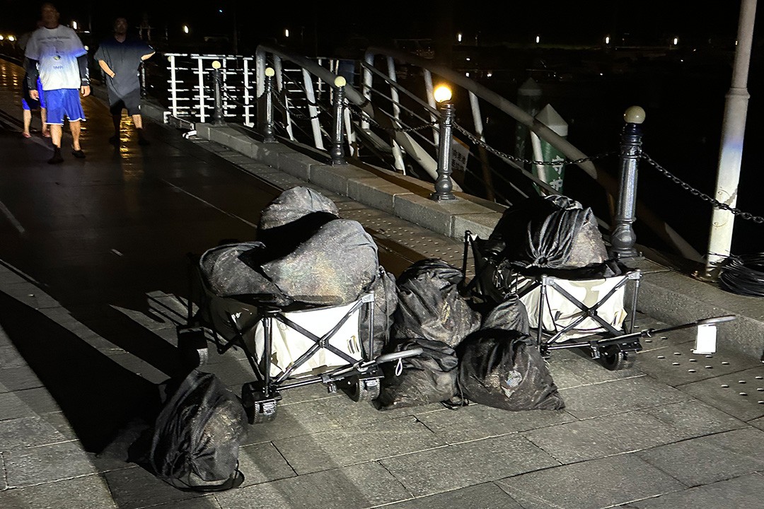然后將海底潛水員清理的垃圾一袋一袋奮力帶上水面。每一袋都有好幾十斤重,12小時(shí)工作結(jié)束后整整有20大袋漁網(wǎng)垃圾被清理干凈。