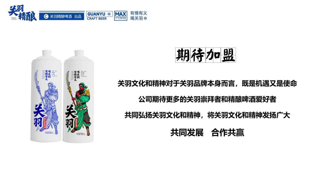 一起傾聽啤酒的故事,品嘗歷史與未來的交織!關(guān)羽精釀啤酒歡迎您的加 盟!作為招商伙伴,您將有機(jī)會(huì):1. 銷售一款融合了傳統(tǒng)和創(chuàng)新,匠心獨(dú)具的產(chǎn)品。2. 加入到一個(gè)持續(xù)增長(zhǎng)的市場(chǎng),一起探索無限可能。3. 受益于關(guān)羽牌精釀啤酒品牌的力量和營(yíng)銷支持,為您的業(yè)務(wù)增添亮點(diǎn)。期待與您一起舉杯慶祝這個(gè)全新的開始,共同描繪這個(gè)世界的多彩魅力,一同追求那份獨(dú)特的美好。有情有義,喝關(guān)羽!