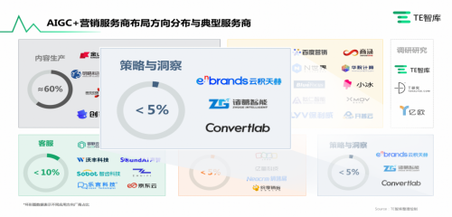 我們從億歐的報(bào)告中可以看到,AIGC+營(yíng)銷(xiāo)目前主要應(yīng)用于內(nèi)容生產(chǎn)、創(chuàng)新運(yùn)營(yíng)、客服、銷(xiāo)售、洞察決策五類(lèi)方向。其中選擇洞察決策方向的服務(wù)商僅占5%。選擇這件難而正確的事情,要求服務(wù)商在營(yíng)銷(xiāo)領(lǐng)域有著深厚實(shí)力,進(jìn)而才能做出這樣的選擇。