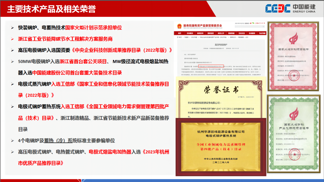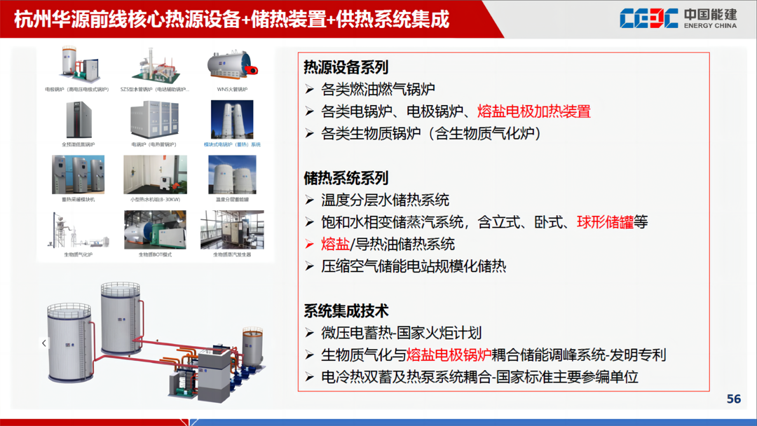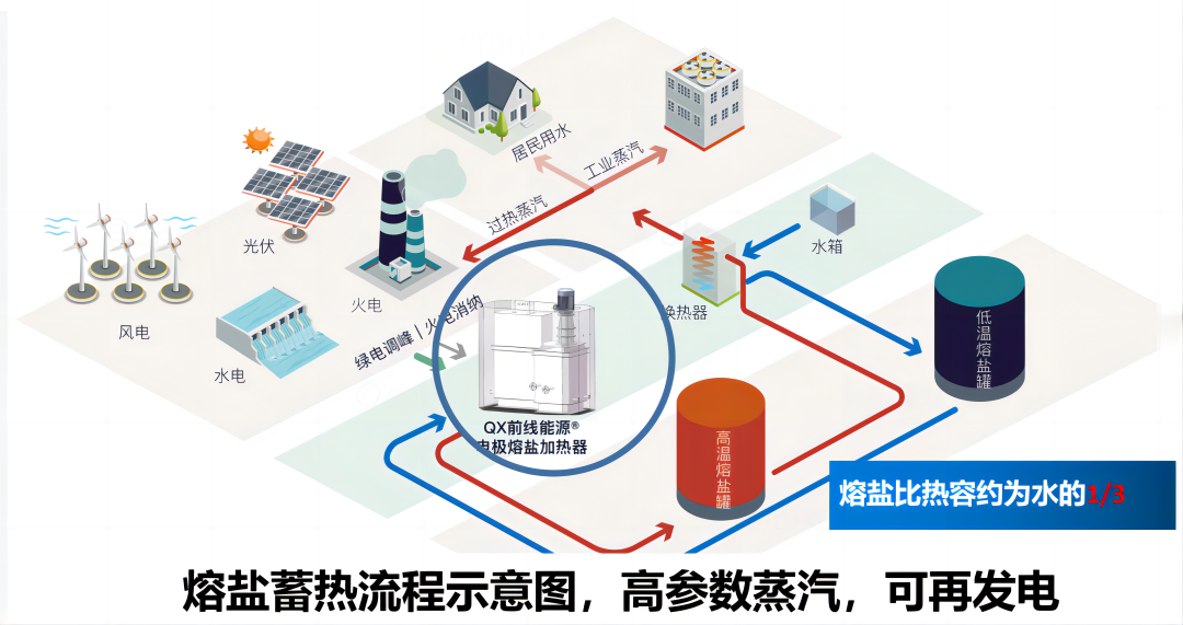 杭州華源前線“電極式熔鹽加熱及儲熱技術(shù)”,采用電極式熔鹽加熱爐與儲熱技術(shù)相結(jié)合的方式。電極式熔鹽加熱爐利用熔鹽高電導率特性,直接發(fā)熱,與常規(guī)電熱管加熱熔鹽形式比較,可實現(xiàn)10KV電直接接入,節(jié)省變壓器及低壓配電設備、單臺加熱功率大(可達50MW以上)、加熱溫度最 高可達600℃以上、占地面積小、耐腐蝕、效率高等優(yōu)點,再與我司儲熱技術(shù)相結(jié)合,可廣泛應用于可再生能源消納、火電廠靈活性調(diào)峰改造等領域。目前該技術(shù)已于2022年8月完成研發(fā)中試,進入商業(yè)應用階段。目前已中標、實施多個項目,將陸續(xù)進入調(diào)試、投運階段。與會嘉賓、專家對我司采用電極式熔鹽加熱解決超高溫、大功率熔鹽電加熱難題,表示充分認可。眾多用戶單位、設計院表現(xiàn)出濃厚興趣,并在現(xiàn)場進行充分交流與探討。