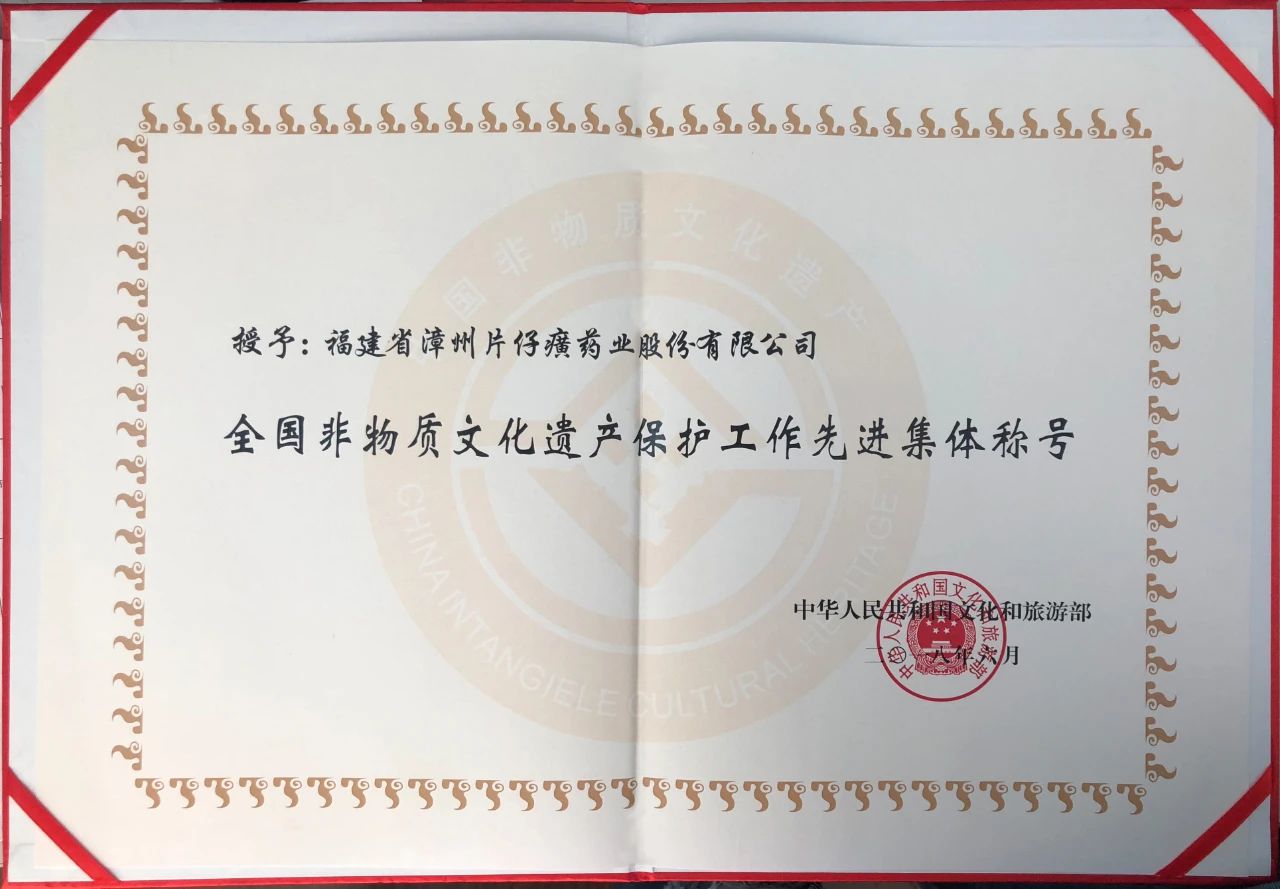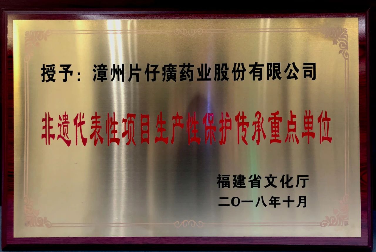 2009年6月,漳州片仔癀入選第三批福建省非物質(zhì)文化遺產(chǎn);2011年5月,漳州片仔癀傳統(tǒng)制作技藝列入國(guó)家級(jí)非物質(zhì)文化遺產(chǎn)項(xiàng)目名錄。片仔癀藥業(yè)多年來一直致力于漳州片仔癀“非遺”文化品牌的保護(hù)、傳承和發(fā)展,積極參與國(guó)家、省、市非遺活動(dòng),獲得全國(guó)首批“非物質(zhì)文化遺產(chǎn)保護(hù)工作先進(jìn)集體”、福建省首批“非遺代表性項(xiàng)目生產(chǎn)性保護(hù)傳承重點(diǎn)單位”等榮譽(yù)稱號(hào)。片仔癀工業(yè)園先后被授予首批“國(guó)家工業(yè)旅游示范基地”、“福建省工業(yè)旅游示范基地”、“福建省工業(yè)旅游示范點(diǎn)”、“福建省觀光工廠”、“愛國(guó)主義教育基地”。