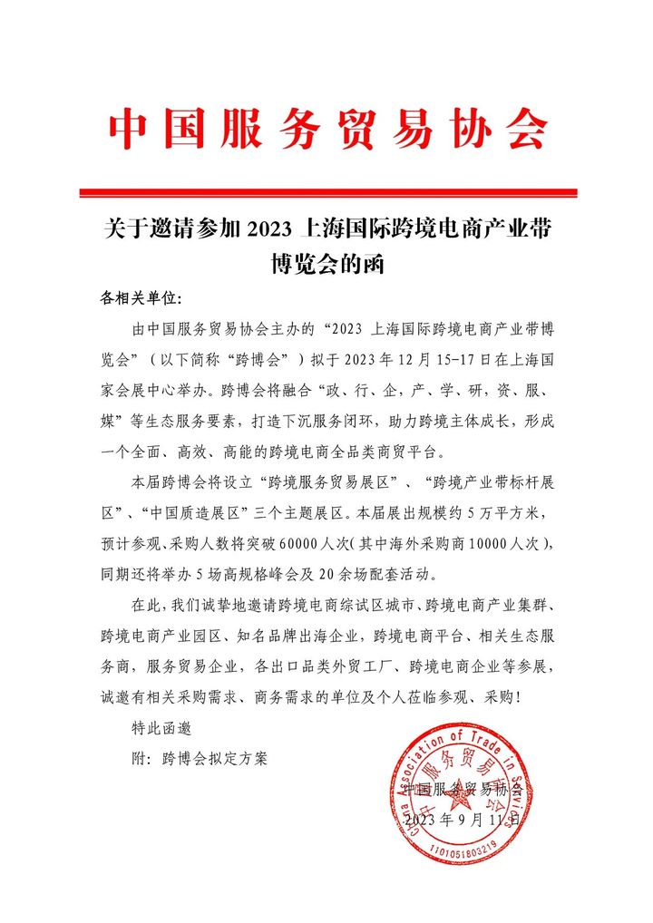 跨博會由中國服務貿易協會主辦,中國服務貿易協會(China Association of Trade in Services,CATIS) 是經國務院批準、民政部登記注冊、商務部籌建設立的具有獨立法人地位的全國性、非營利社會團體。旨在服務國家優(yōu)化國際貿易結構、突出發(fā)展服務貿易戰(zhàn)略。
