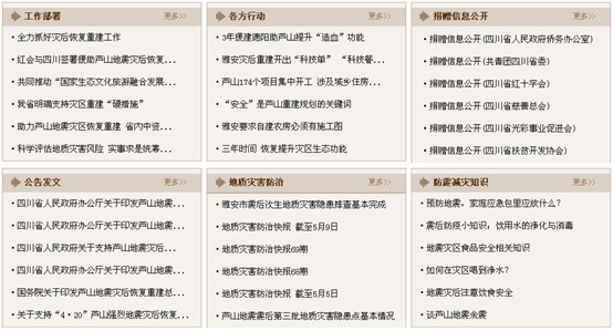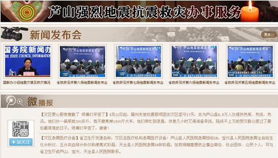 四川省人民政府網(wǎng)站在“4·20”蘆山地震中,第一時(shí)間制作專題,專題內(nèi)容實(shí)現(xiàn)7*24小時(shí)不間斷更新。及時(shí)公開政府第一手信息,內(nèi)容全面、透明、信息量大;欄目合理實(shí)用;內(nèi)容互動(dòng)性強(qiáng)。使政府信息在短時(shí)間內(nèi)形成抗災(zāi)救災(zāi)的合力,充分發(fā)揮了信息公開第一平臺、權(quán)威平臺的作用。