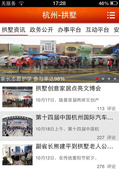 (2)打造移動(dòng)門戶。當(dāng)前信息通信技術(shù)迅猛發(fā)展,信息網(wǎng)絡(luò)和智能終端迅速普及,手機(jī)網(wǎng)民迅速增加,為提高政府服務(wù)的高度,提供更好更舒適便捷的用戶體驗(yàn),加強(qiáng)“杭州?拱墅”門戶網(wǎng)站的覆蓋面,初步建設(shè)移動(dòng)門戶,實(shí)現(xiàn)移動(dòng)用戶(iOS平臺(tái))實(shí)時(shí)訪問門戶網(wǎng)站內(nèi)容,并對(duì)安裝移動(dòng)拱墅門戶推送相關(guān)重點(diǎn)信息,同時(shí)為智慧拱墅移動(dòng)平臺(tái)搭建初步入口。杭州拱墅移動(dòng)門戶(微門戶)客戶端,能夠及時(shí)發(fā)布“杭州?拱墅”的最新信息,內(nèi)容包含拱墅動(dòng)態(tài)、政府信息公開、了解拱墅、網(wǎng)上辦事指南、政民互動(dòng)等,支持微博推送分享、個(gè)性化訂閱、全文檢索功能,為公眾提供更快捷的服務(wù)。