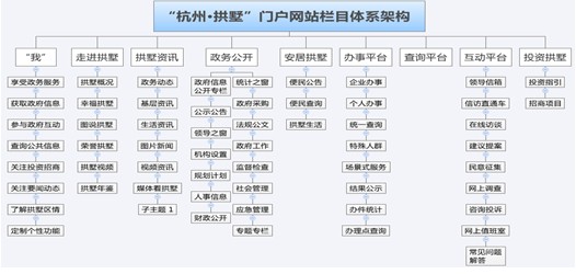 ?。?)進(jìn)一步優(yōu)化網(wǎng)站欄目架構(gòu)體系。2013年,“杭州?拱墅”門戶網(wǎng)站對(duì)網(wǎng)站欄目架構(gòu)體系進(jìn)行優(yōu)化,按照以“用戶為中心,服務(wù)為導(dǎo)向”的服務(wù)型政府網(wǎng)站建設(shè)宗旨,通過科學(xué)規(guī)劃、信息資源整合、共享,突出拱墅區(qū)資源特色,在網(wǎng)站欄目組織架構(gòu)、瀏覽便捷、頁(yè)面布局、搜索設(shè)置、內(nèi)容完整等方面進(jìn)行完善。通過優(yōu)化欄目架構(gòu)和服務(wù)體系,不斷提升網(wǎng)站的綜合水平,創(chuàng)新服務(wù)內(nèi)容和服務(wù)形式,提高“杭州?拱墅”門戶網(wǎng)站的服務(wù)深度。網(wǎng)站欄目?jī)?yōu)化包括1個(gè)索引式導(dǎo)航和8個(gè)一級(jí)欄目、51個(gè)二級(jí)欄目,具體欄目體系的結(jié)構(gòu)如下圖所示: