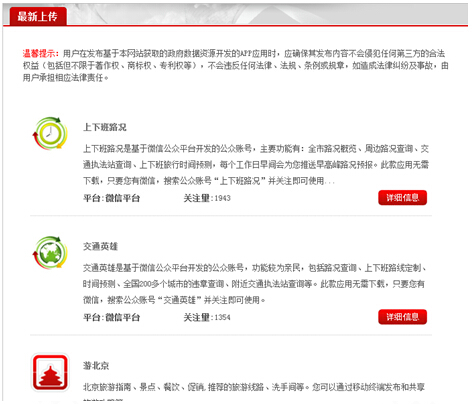 ?。?)提供專門的"APP應(yīng)用"欄目,社會(huì)力量可以通過(guò)該欄目上傳基于該網(wǎng)站獲取的政府?dāng)?shù)據(jù)資源開發(fā)的APP應(yīng)用,供用戶下載使用。目前,該欄目已上傳"上下班路況"、"交通英雄"、"游北京"、"愛健康"等應(yīng)用。
