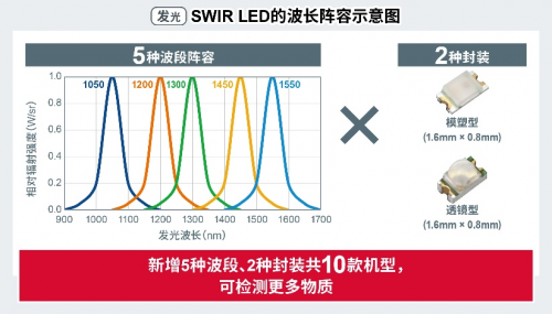 由于不同物質(zhì)的檢測(cè)波長(zhǎng)不同,所以發(fā)光側(cè)的SWIR LED預(yù)計(jì)會(huì)推出1050nm、1200nm、1300nm、1450nm、1550nm共5種波長(zhǎng)的產(chǎn)品,除了常規(guī)的模塑型產(chǎn)品外,還將推出兩款透鏡型(發(fā)光指向角更窄、輻射強(qiáng)度更高)表貼封裝的產(chǎn)品。屆時(shí),通過(guò)這些產(chǎn)品的組合預(yù)計(jì)會(huì)推出10款新產(chǎn)品,這將有助于擴(kuò)大檢測(cè)范圍,在檢測(cè)水、氣體和葡萄糖等物質(zhì)的有無(wú)以及成分分析等應(yīng)用中發(fā)揮重要作用。