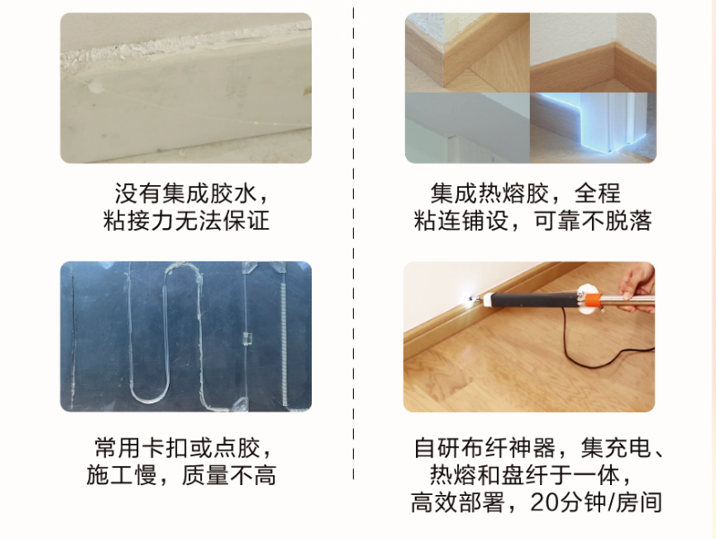 相較沒有集成膠水、粘接力無保證的普通透明光纜,其透明光纜不僅自帶“隱身術”,裝好后絲毫不會給人一種亂糟糟的感覺,由于集成了熱熔膠,它還支持全程粘連鋪設,減少了后續(xù)脫落的風險。