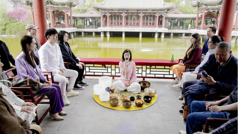 整場活動由頌缽音療體驗(yàn)開始,亭外郡王府春風(fēng)十里,光音工坊創(chuàng)始人尹欣女士一擊輕柔而沉穩(wěn)的缽響,拉開整場活動的序幕。此刻喧囂慢慢退去,鳥語、花香、微風(fēng)伴著如流水的缽聲,讓大家立刻放下了煩惱和疲憊,得到身心的舒展。