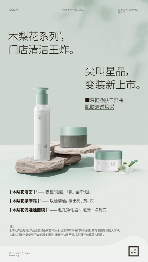 精準錨定毛孔粗大、黑頭粉刺等肌膚問題、精準篩選凈澈亮顏功效成分、極簡純凈配方……三草兩木木梨花清肌凈澈系列是品牌“精準純凈護膚”的又一例證,也是對萬千消費者承諾的深度踐行。