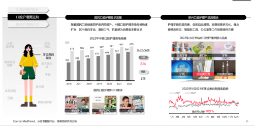 比如頭發(fā)護理中,頭皮和頭發(fā)的護理分開,頭皮精華/干發(fā)噴霧增長迅速,頭皮修護/抗老進階需求增速迅猛。口腔護理中,沖牙器、美白貼等新品類增速很快,根據(jù)《趨勢報告》數(shù)據(jù),*2022年站內(nèi)美白牙貼相關搜索同比增長189%,用戶也會更關注這些工具使用方法。