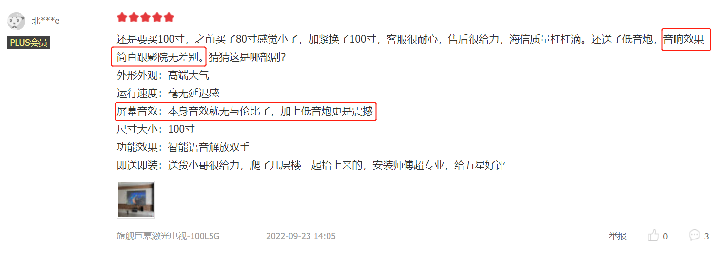 同時,該產(chǎn)品機體以科技感外殼搭配混織網(wǎng)罩,典雅大氣,與高格調現(xiàn)代客廳完美融為一體。用戶對100L5G的高顏值贊不絕口,“美觀好看”“大氣”“高級”成為高頻詞匯。