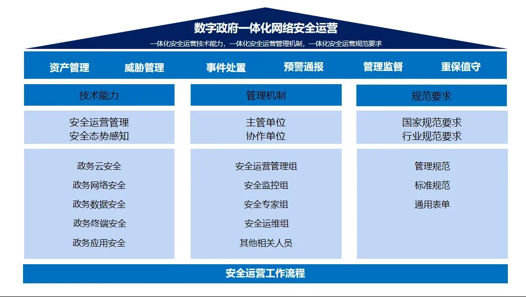 指南中通過“兩橫三縱”的模式構(gòu)建數(shù)字政 府一體化安全運營總體架構(gòu),“兩橫”即安全運營工作所開展的關(guān)鍵業(yè)務(wù)類別,以及為支撐關(guān)鍵業(yè)務(wù)運行而統(tǒng)籌構(gòu)建的安全運營工作流程?!叭v”即技術(shù)能力、管理機制、規(guī)范要求,技術(shù)能力是針對網(wǎng)絡(luò)安全運營工作開展所需的技術(shù)工具,提供風險發(fā)現(xiàn)、協(xié)同處置、指揮決策、態(tài)勢呈現(xiàn)、統(tǒng)籌管理等技術(shù)措施;管理機制是依據(jù)網(wǎng)絡(luò)安全運營工作開展需要,建立相關(guān)的團隊組織,在明確的“權(quán)、責、義”的邊界范圍下,有效開展安全管理、監(jiān)測預警、高效協(xié)同、應(yīng)急指揮等工作;規(guī)范要求是在遵循國家法律法規(guī)、行業(yè)標準規(guī)范的前提下,結(jié)合實際情況,明確安全運營工作中的管理要求、標準規(guī)范、表單記錄等內(nèi)容,為數(shù)字政 府行業(yè)網(wǎng)絡(luò)安全運營工作奠定基礎(chǔ)。