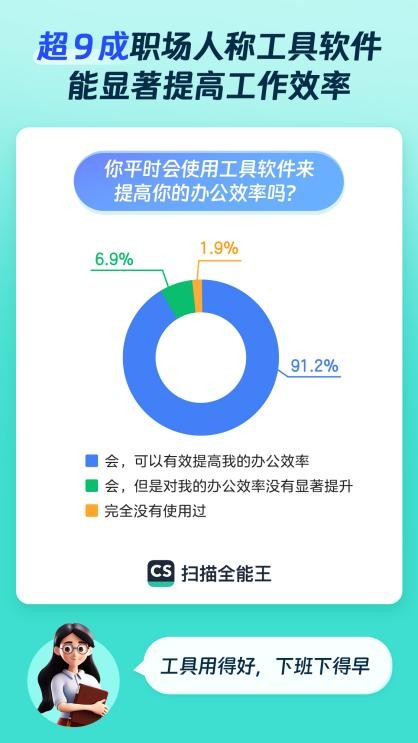 近期,合合信息旗下掃描全能王發(fā)布了《當(dāng)代職場人辦公習(xí)慣洞察報告》(以下簡稱“《報告》”),對五百余位職場人士進(jìn)行了辦公工具軟件使用習(xí)慣調(diào)研。《報告》顯示,超9成的職場人會使用工具類軟件,并表示其能顯著提高工作效率。