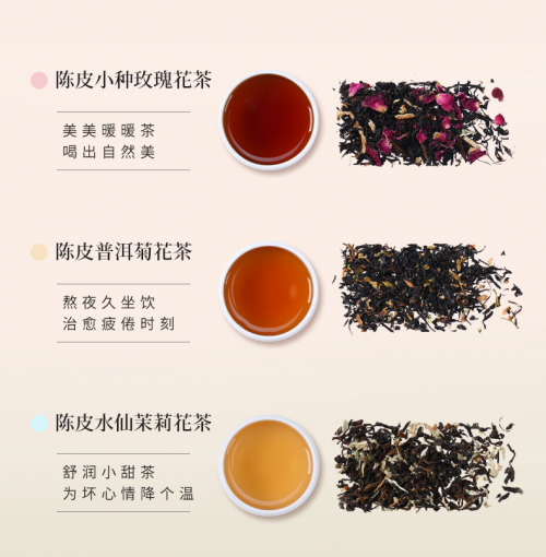 調(diào)味茶的創(chuàng)意無處不在,每一杯都是調(diào)思與精細(xì)工藝的結(jié)晶——陳皮普洱菊花調(diào)味茶、陳皮小種玫瑰花調(diào)味茶、陳皮水仙茉莉花調(diào)味茶,都是正印堂旗下的陳皮調(diào)味茶產(chǎn)品 。菊花清心,解燥;茉莉健脾開胃、提神醒腦;玫瑰疏肝解郁,理氣消食 、美容養(yǎng)顏。