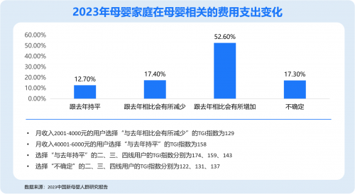 據(jù)2023中國新母嬰人群研究報告數(shù)據(jù)顯示,與2022年相比,盡管仍有52.6%的母嬰消費者在母嬰相關(guān)的費用支出上會有所增加,但近五成母嬰用戶消費意愿無明顯變化甚至偏保守悲觀。