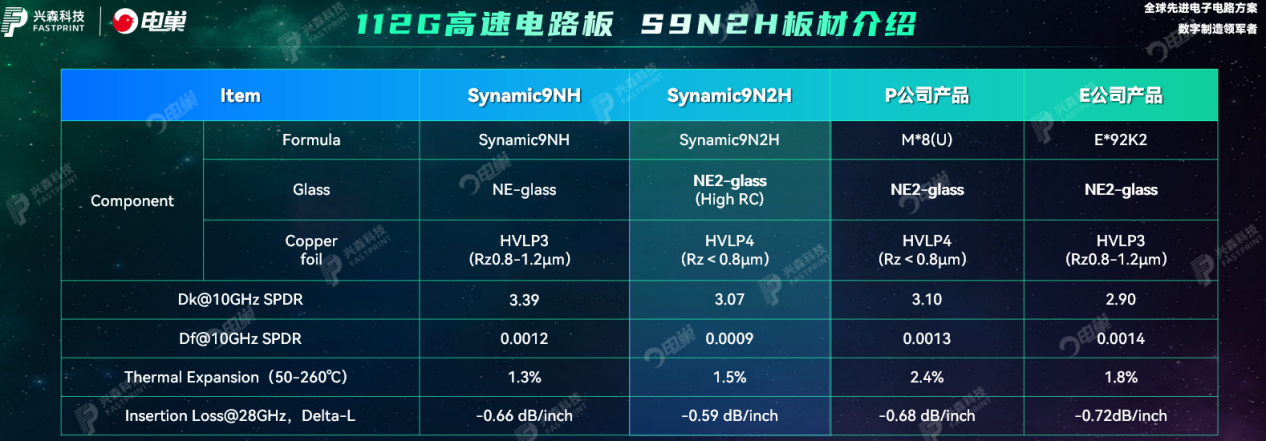 以生益科技S9NH板材為例,這是一款超低損耗高多層高可靠性電路板基材,其相對于行業(yè)內(nèi)的同級別產(chǎn)品,具有更低的熱膨脹系數(shù)和更好的介電性能。S9NH采用NE-glass做增強(qiáng)材料時,可達(dá)到P公司產(chǎn)品使用NE2-glass的插損水平,NE2-glass目前在行業(yè)內(nèi)的供應(yīng)不足,因此S9NH具有更好的供應(yīng)和成本優(yōu)勢。S9N2H采用NE2-glass和High RC的方案在測試中表現(xiàn)出112G+或接近224G應(yīng)用的水平,目前已在國內(nèi)主要終端的公司進(jìn)行認(rèn)證測試。