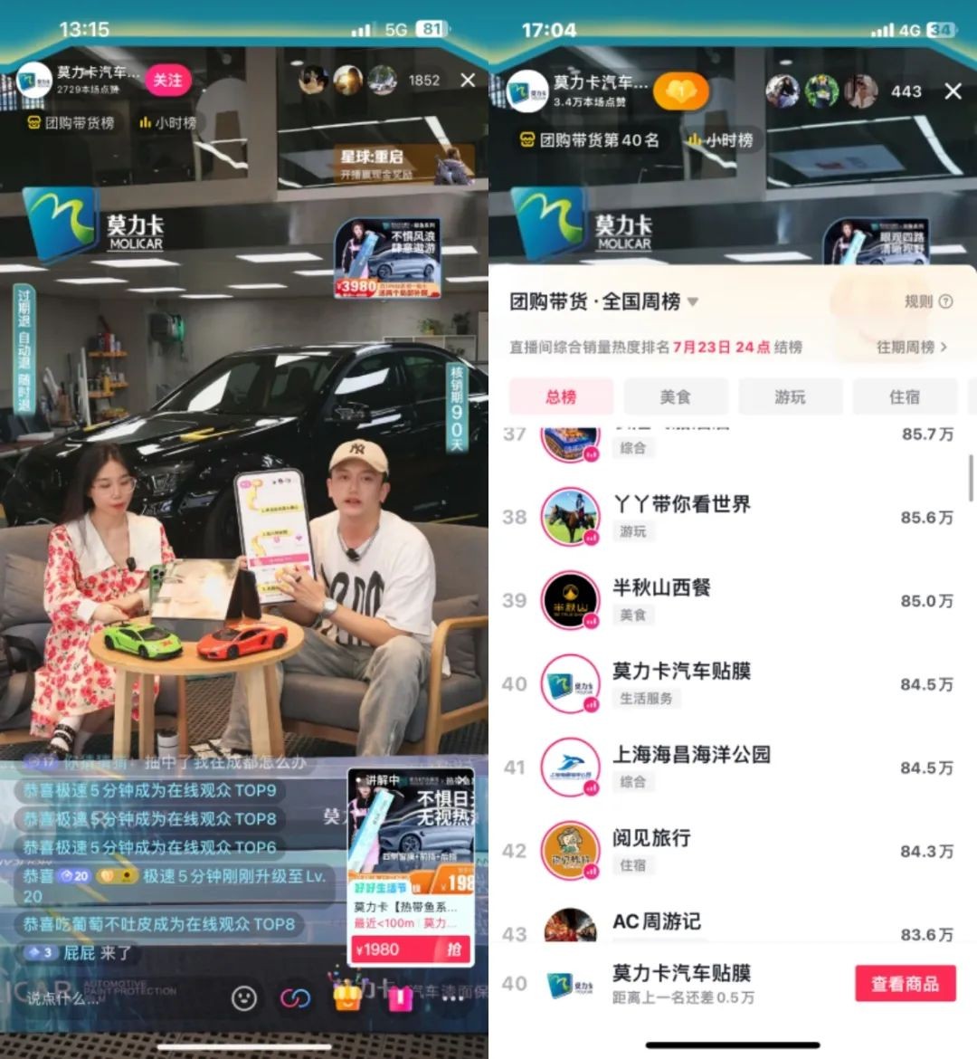 直播間是新消費場景的重構(gòu),一個具有真實消費場景和產(chǎn)品對應(yīng)的元素,能提升用戶參與度與體驗感。莫力卡汽車貼膜聯(lián)合抖音本地生活服務(wù)商恒樂影視推選具有完備直播能力的主播,提前一周向商家學(xué)習(xí)汽車貼膜行業(yè)的相關(guān)知識,并同步準(zhǔn)備直播過程中每個節(jié)點對應(yīng)的知識講解,為直播間優(yōu)質(zhì)內(nèi)容的輸出打下堅實基礎(chǔ)。同時,莫力卡汽車配合門店場景搭建了“云貼膜”空間,在整個直播過程中,他們精細(xì)化把控汽車貼膜的產(chǎn)品畫面露出、產(chǎn)品價值呈現(xiàn)、用戶評論互動、福利下單、產(chǎn)品組合等一切環(huán)節(jié),時刻關(guān)注產(chǎn)品對直播間人氣的影響,在此基礎(chǔ)上不斷調(diào)優(yōu),提升了直播間的轉(zhuǎn)化效能。