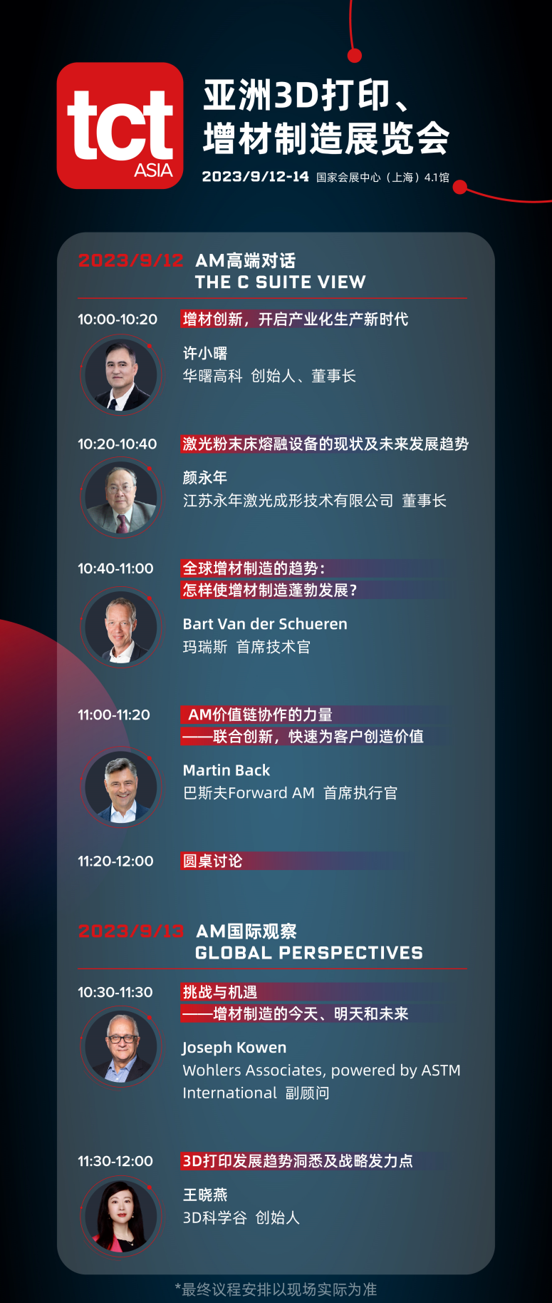 今年,主辦方特別策劃AM高端對(duì)話與AM國(guó)際觀察。其中,AM高端對(duì)話The C Suite View匯聚全球增材制造行業(yè)內(nèi)具有影響力的企業(yè)高管,華曙高科的許小曙博士,江蘇永年激光的顏永年教授,瑪瑞斯的Bart Van der Schueren先生,以及巴斯夫Forward AM的Martin Back先生。全新打造以洞悉3D打印行業(yè)趨勢(shì)、預(yù)測(cè)未來發(fā)展為著力點(diǎn)的AM國(guó)際觀察Global Perspectives邀請(qǐng)了來自Wohlers Associates, powered by ASTM International的Joseph Kowen先生,以及3D科學(xué)谷的創(chuàng)始人王曉燕女士,他們將從企業(yè)家角度,行業(yè)觀察者角度,深度剖析當(dāng)前行業(yè)的市場(chǎng)現(xiàn)狀、前景展望及發(fā)展對(duì)策。