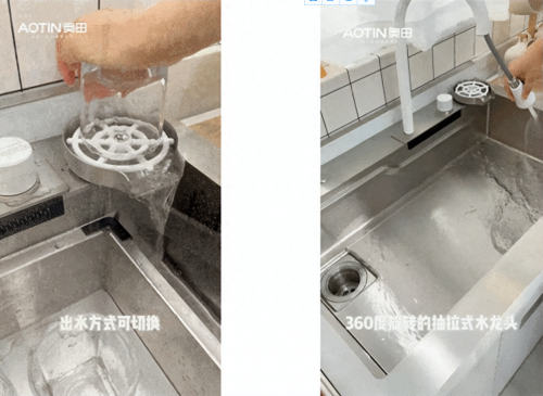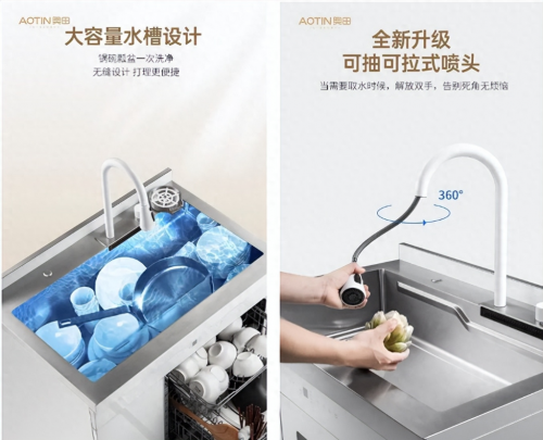 相比傳統(tǒng)水槽窄小淺、菜板鍋具清洗放不下的難題,奧田采用匠心工藝,實現(xiàn)了寬深兼?zhèn)涞拇笸ú墼O(shè)計,800×415mm超大空間的水槽,諸如炒鍋等中式烹飪大型鍋具也能妥妥放下,方便又省心!360°旋轉(zhuǎn)抽拉式水龍頭,清潔無死角。