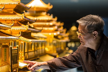 (上:花絲鑲嵌工藝大師姚迎春指導(dǎo)潮宏基“臻寶博物館”鎮(zhèn)館之寶“花絲風雨橋”設(shè)計制作;