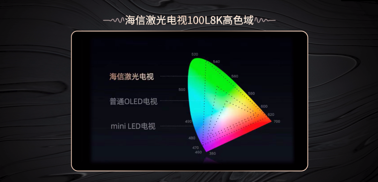 電視的色域覆蓋越廣,所能呈現(xiàn)出來的畫面色彩就越細(xì)膩豐富,海信L8K色域高達(dá)110%BT.2020,遠(yuǎn)超普通電視,是全球顯示行業(yè)的最 高色域水平。